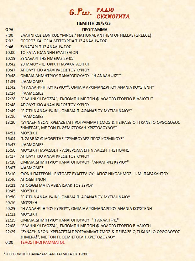 Σήμερα 29/5/25,  μπορείτε να ακούσετε :