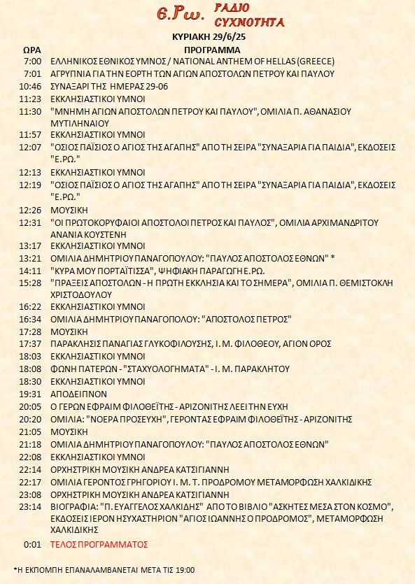 29/6/25 – Πρόγραμμα Λειτουργίας Ραδιοφώνου ΕΡΩ: “Ε.Ρω. – ΡαδιοΣυχνότητα”