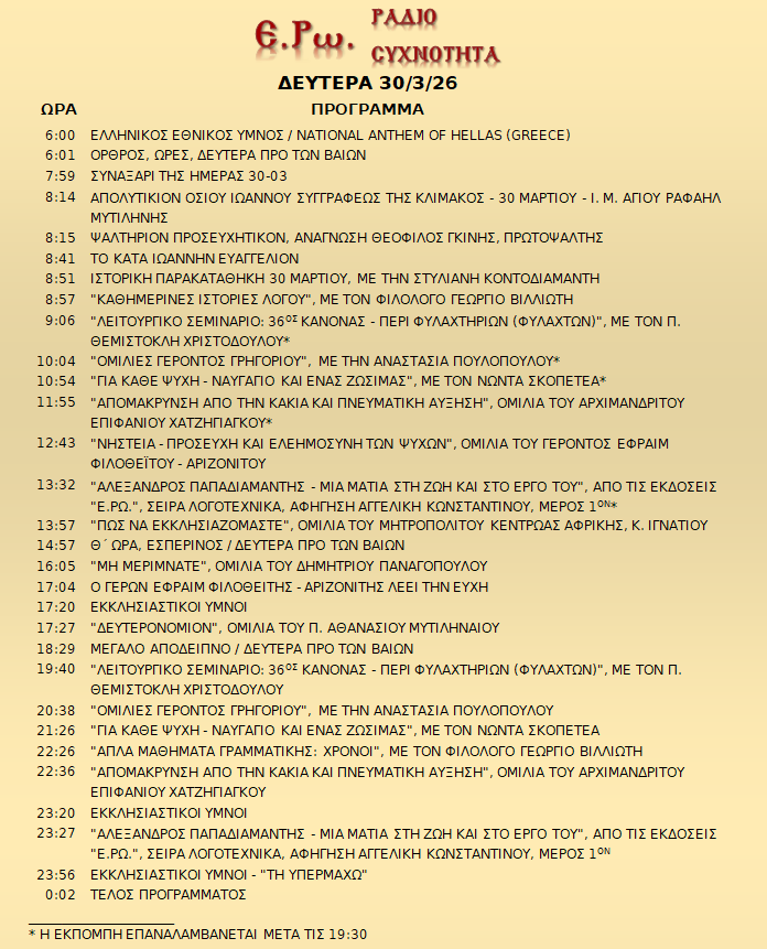 30/03/26 – Πρόγραμμα Λειτουργίας Ραδιοφώνου ΕΡΩ: “Ε.Ρω. – ΡαδιοΣυχνότητα”