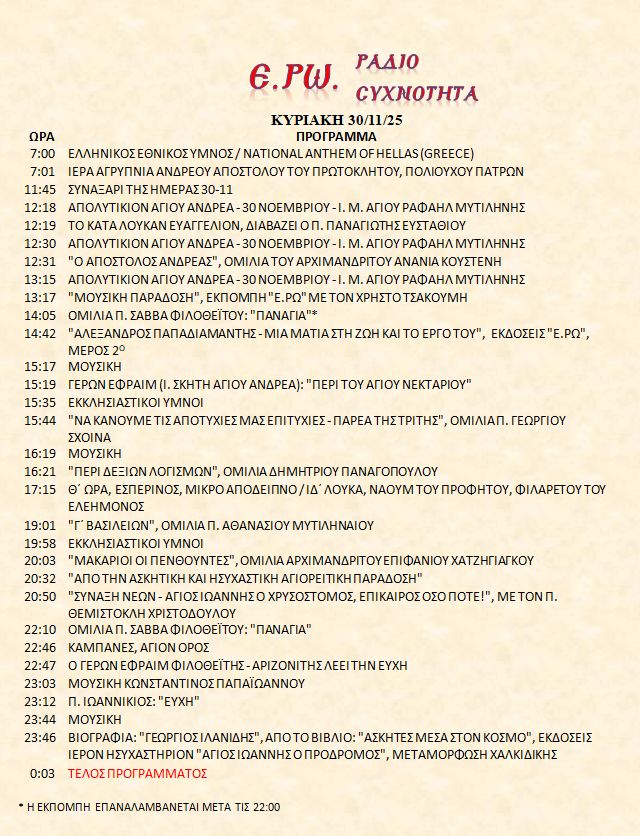 30 Νοεμβρίου 2025 σε ΕΡΩ - ΡαδιοΣυχνότητα Σήμερα 30/11/25, μπορείτε να ακούσετε: Γιὰ τὴ σύνδεση μπορεῖτε νὰ πατήστε στην παρακάτω εικόνα : ή χρησιμοποιήσετε τὸ παρακάτω link : Πρόγραμμα Λειτουργίας Ραδιοφώνου ΕΡΩ: “Ε.Ρω. – ΡαδιοΣυχνότητα”https://welove.radio/radio/ero-radiosixnotita/ Καλή σας ακρόαση Ετικέτες - Σχετικά Θέματα ΕΡΩ ΡΑΔΙΟΦΩΝΟ ΕΡΩ-ΡΑΔΙΟΣΥΧΝΟΤΗΤΑ Προηγούμενο