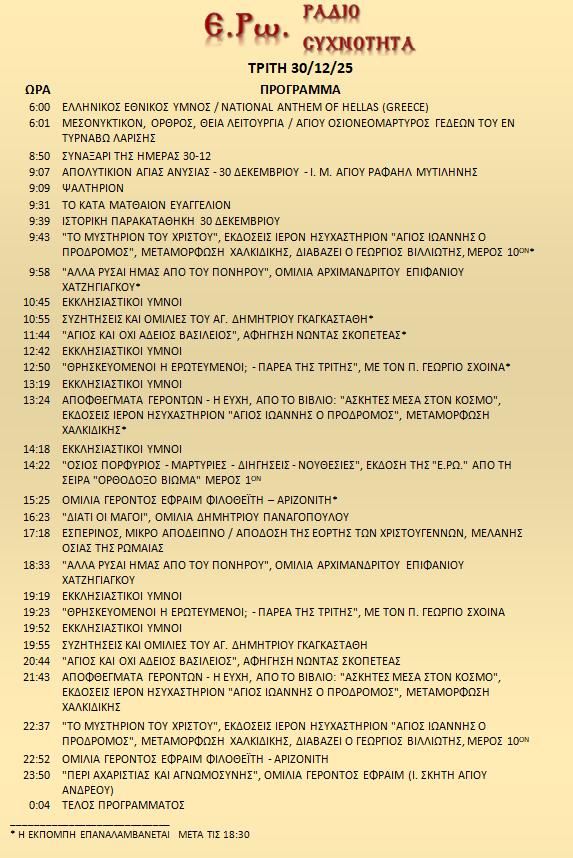 30 Δεκεμβρίου 2025 σε ΑΡΧΕΙΑ ΗΧΟΥ, ΕΡΩ - ΡαδιοΣυχνότητα, ΟΠΤΙΚΟΑΚΟΥΣΤΙΚΟ ΥΛΙΚΟ Σήμερα 30/12/25, μπορείτε να ακούσετε: Γιὰ τὴ σύνδεση μπορεῖτε νὰ πατήστε στην παρακάτω εικόνα : ή χρησιμοποιήσετε τὸ παρακάτω link : Πρόγραμμα Λειτουργίας Ραδιοφώνου ΕΡΩ: “Ε.Ρω. – ΡαδιοΣυχνότητα”https://welove.radio/radio/ero-radiosixnotita/ Καλή σας ακρόαση Ετικέτες - Σχετικά Θέματα ΕΡΩ ΡΑΔΙΟΦΩΝΟ ΕΡΩ-ΡΑΔΙΟΣΥΧΝΟΤΗΤΑ Προηγούμενο