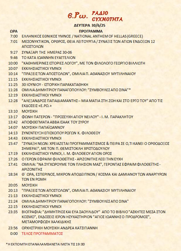 30 Ιουνίου 2025 σε ΑΡΧΕΙΑ ΗΧΟΥ, ΕΡΩ - ΡαδιοΣυχνότητα, ΟΠΤΙΚΟΑΚΟΥΣΤΙΚΟ ΥΛΙΚΟ Σήμερα 30/6/25, μπορείτε να ακούσετε : Γιὰ τὴ σύνδεση μπορεῖτε νὰ πατήστε στην παρακάτω εικόνα : ή χρησιμοποιήσετε τὸ παρακάτω link : Πρόγραμμα Λειτουργίας Ραδιοφώνου ΕΡΩ: “Ε.Ρω. – ΡαδιοΣυχνότητα”https://welove.radio/radio/ero-radiosixnotita/ Καλή σας ακρόαση Ετικέτες - Σχετικά Θέματα ΕΡΩ ΡΑΔΙΟΦΩΝΟ ΕΡΩ-ΡΑΔΙΟΣΥΧΝΟΤΗΤΑ Προηγούμενο