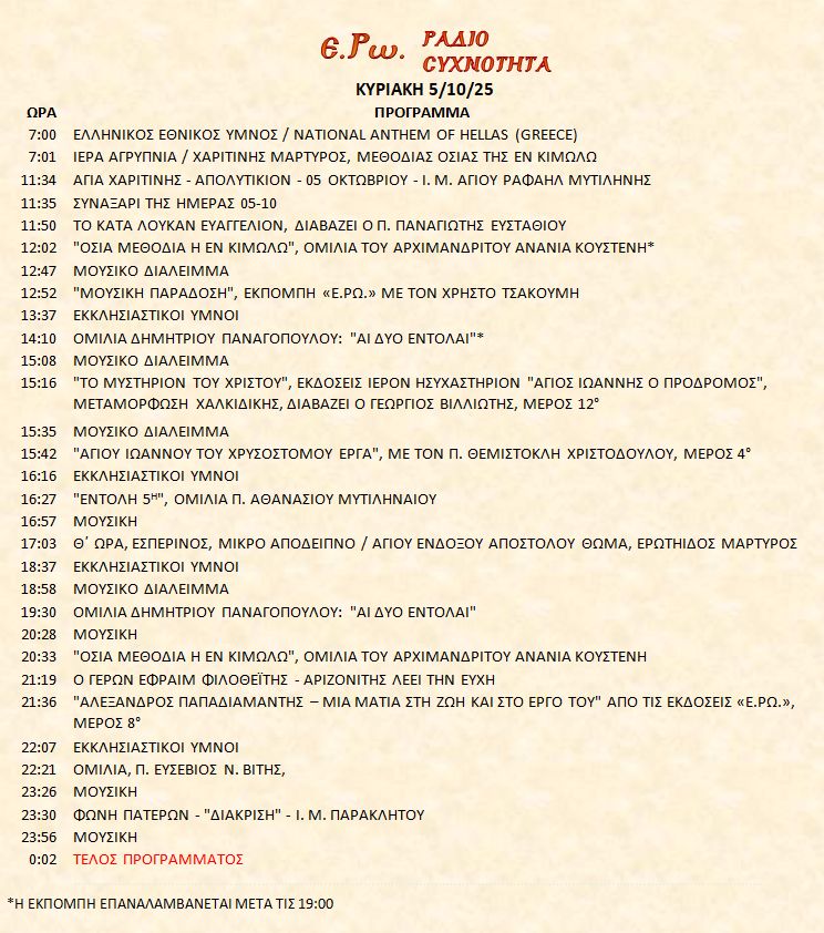 5 Οκτωβρίου 2025 σε ΑΡΧΕΙΑ ΗΧΟΥ, ΕΡΩ - ΡαδιοΣυχνότητα, ΟΠΤΙΚΟΑΚΟΥΣΤΙΚΟ ΥΛΙΚΟ Σήμερα 5/10/25, μπορείτε να ακούσετε: Γιὰ τὴ σύνδεση μπορεῖτε νὰ πατήστε στην παρακάτω εικόνα : ή χρησιμοποιήσετε τὸ παρακάτω link : Πρόγραμμα Λειτουργίας Ραδιοφώνου ΕΡΩ: “Ε.Ρω. – ΡαδιοΣυχνότητα”https://welove.radio/radio/ero-radiosixnotita/ Καλή σας ακρόαση Ετικέτες - Σχετικά Θέματα ΕΡΩ ΡΑΔΙΟΦΩΝΟ ΕΡΩ-ΡΑΔΙΟΣΥΧΝΟΤΗΤΑ Προηγούμενο