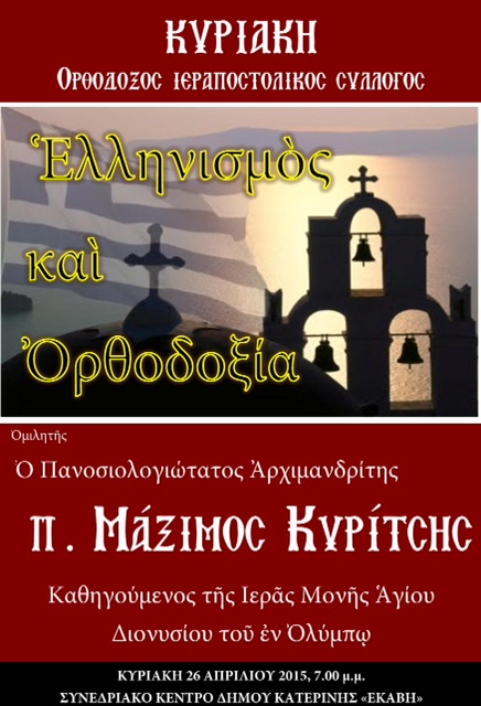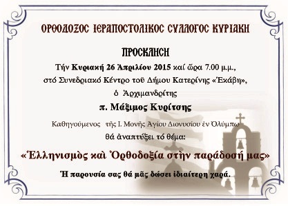 Σας επισυνάπτουμε πρόσκληση και αφίσα για την εκδήλωση που διοργανώνει ο Ιεραποστολικός Σύλλογος “Κυριακή” την Κυριακή 26 Απριλίου 2015 στις 7.00 μ.μ., στο Συνεδριακό Κέντρο του Δήμου Κατερίνης «Εκάβη», με ομιλητή τον Πανοσιολογιώτατο Αρχιμανδρίτη π. Μάξιμο Κυρίτση, Καθηγούμενο της Ιεράς Μονής Αγίου Διονυσίου εν Ολύμπω, ο οποίος θα αναπτύξει το θέμα: