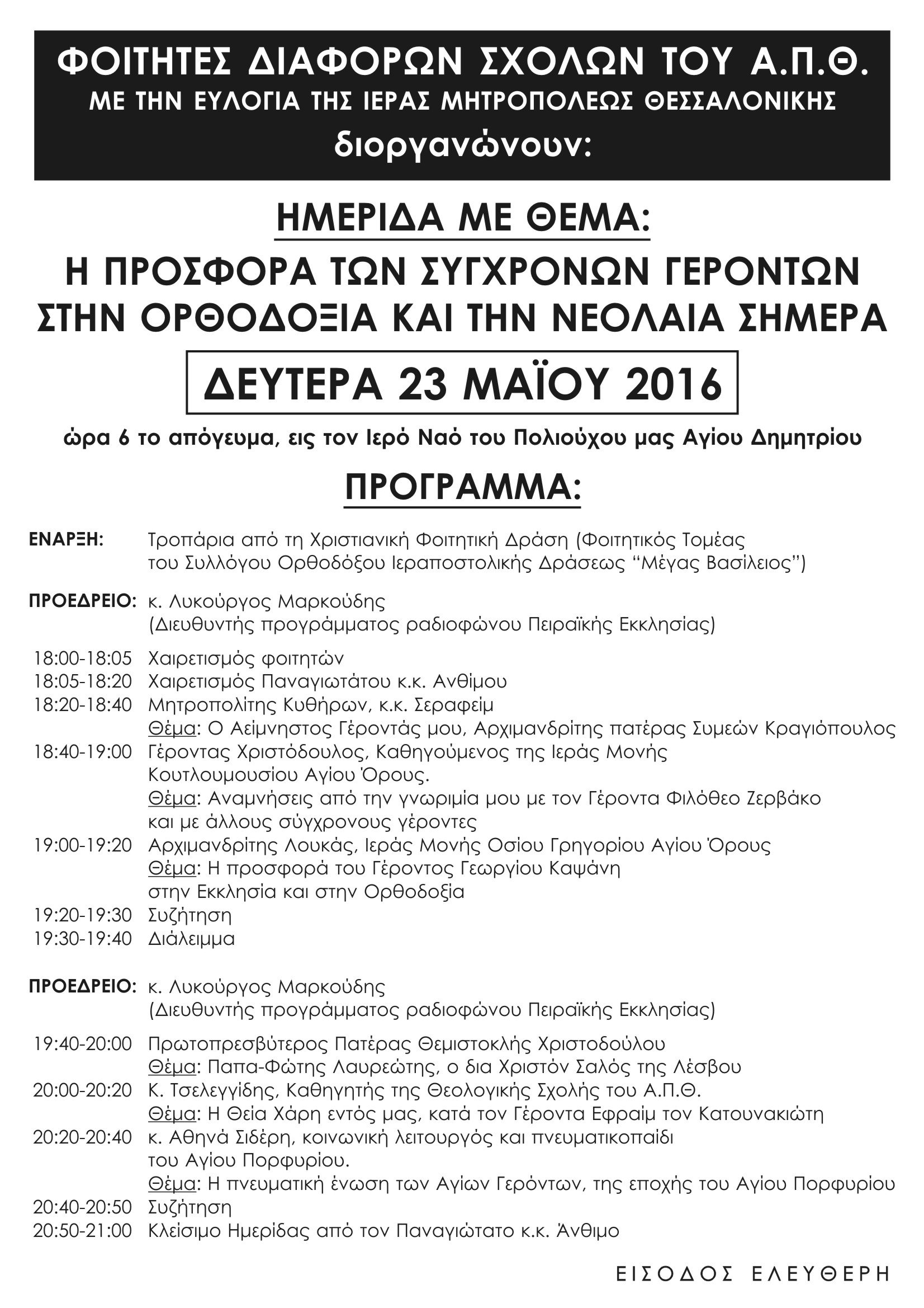 10 Μαΐου 2016 σε ΗΜΕΡΙΔΕΣ-ΕΚΔΗΛΩΣΕΙΣ, ΧΑΡΤΗΣ ΘΕΣΣΑΛΟΝΙΚΗΣ, ΧΑΡΤΗΣ ΡΩΜΝΙΩΝ Ετικέτες - Σχετικά Θέματα ΗΜΕΡΙΔΑ ΜΕ ΘΕΜΑ: Η ΠΡΟΣΦΟΡΑ ΤΩΝ ΣΥΓΧΡΟΝΩΝ ΓΕΡΟΝΤΩΝ ΣΤΗΝ ΟΡΘΟΔΟΞΙΑ ΚΑΙ ΤΗΝ ΝΕΟΛΑΙΑ ΣΗΜΕΡΑ Επόμενο Προηγούμενο