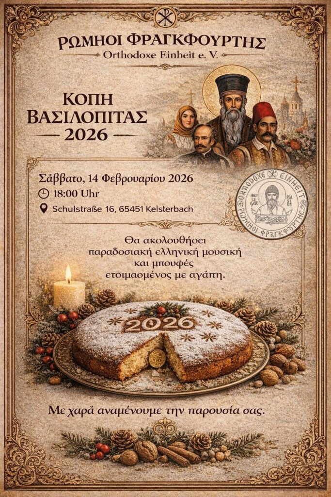 Με τη Χάρη του Θεού, το Σωματείο μας Orthodoxe Einheit e.V. Ρωμηοί Φρανκφούρτης και Ρωμηοί Ντυσσελντορφ έχει την τιμή και τη χαρά να σας προσκαλέσει στην κοπή της Βασιλόπιτας 2026, μια ευλογημένη στιγμή για τον Σύλλογο μας και την ενίσχυση του πνευματικού και πολιτιστικού έργου μας.