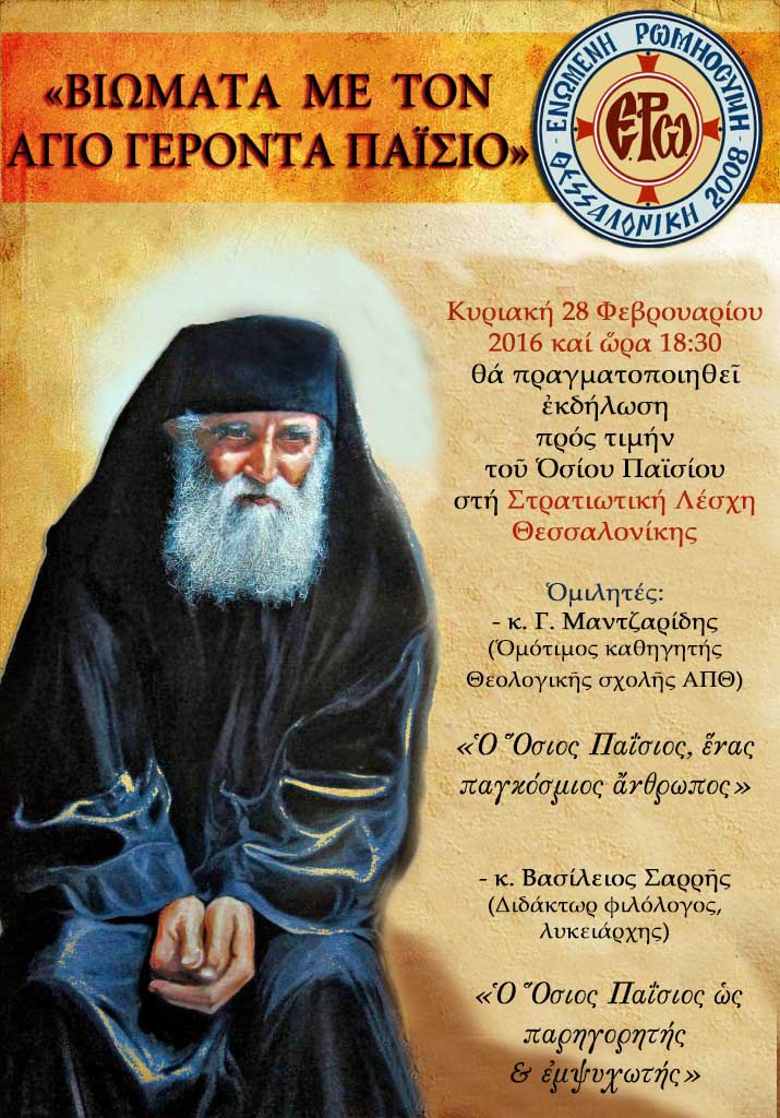 27 Φεβρουαρίου 2016 σε ΗΜΕΡΙΔΕΣ-ΕΚΔΗΛΩΣΕΙΣ, ΧΑΡΤΗΣ ΘΕΣΣΑΛΟΝΙΚΗΣ, ΧΑΡΤΗΣ ΡΩΜΝΙΩΝ Ετικέτες - Σχετικά Θέματα "ΒΙΩΜΑΤΑ ΜΕ ΤΟΝ ΑΓΙΟ ΓΕΡΟΝΤΑ ΠΑΙΣΙΟ" ΣΤΗΝ ΘΕΣΣΑΛΟΝΙΚΗ ΤΗΝ 28/2/2016 Επόμενο Προηγούμενο
