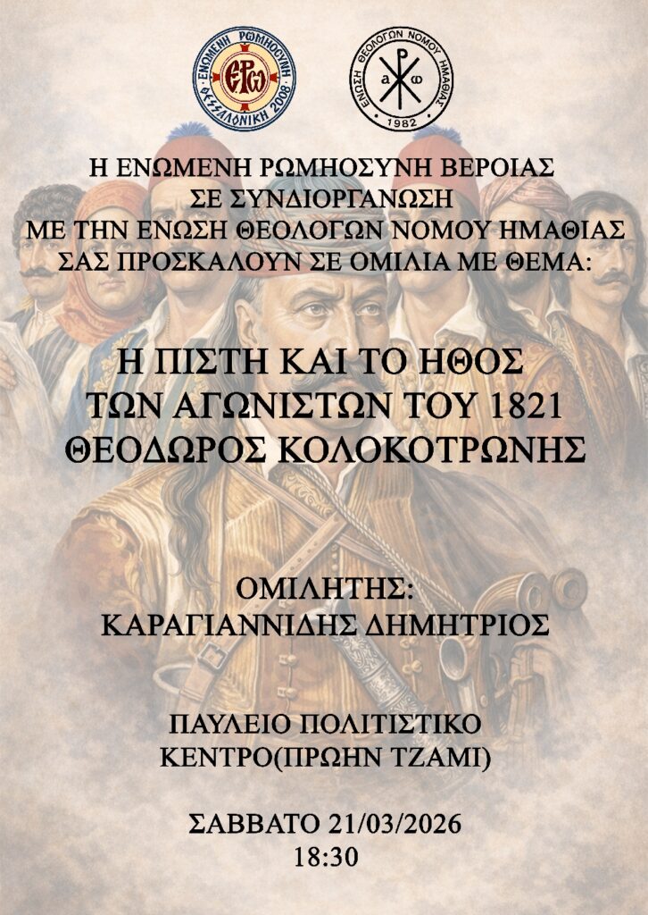 Στα πλαίσια της Εθνικής μας εορτής, της 25ης Μαρτίου, η Ενωμένη Ρωμηοσύνη στην Βέροια σε συνδιοργάνωση με την Ένωση Θεολόγων Νομού Ημαθίας σας προσκαλούν στην εκδήλωση με θέμα: «Η πίστη και το ήθος των αγωνιστών του 1821, Θεόδωρος Κολοκοτρώνης.