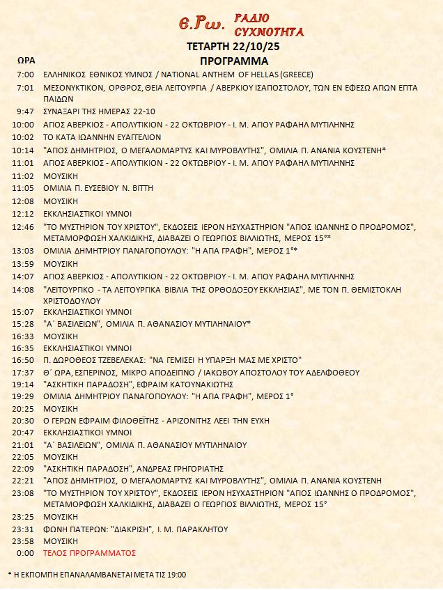 22 Οκτωβρίου 2025 σε ΑΡΧΕΙΑ ΗΧΟΥ, ΕΡΩ - ΡαδιοΣυχνότητα, ΟΠΤΙΚΟΑΚΟΥΣΤΙΚΟ ΥΛΙΚΟ Σήμερα 22/10/25, μπορείτε να ακούσετε: Γιὰ τὴ σύνδεση μπορεῖτε νὰ πατήστε στην παρακάτω εικόνα : ή χρησιμοποιήσετε τὸ παρακάτω link : Πρόγραμμα Λειτουργίας Ραδιοφώνου ΕΡΩ: “Ε.Ρω. – ΡαδιοΣυχνότητα”https://welove.radio/radio/ero-radiosixnotita/ Καλή σας ακρόαση Ετικέτες - Σχετικά Θέματα ΕΡΩ ΡΑΔΙΟΦΩΝΟ ΕΡΩ-ΡΑΔΙΟΣΥΧΝΟΤΗΤΑ Προηγούμενο