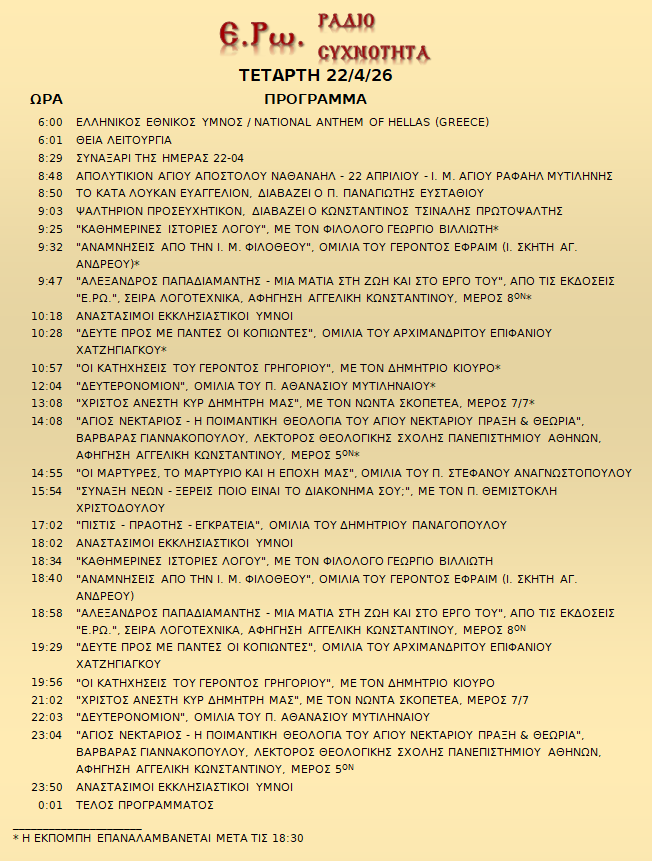22/4/26 – Πρόγραμμα Λειτουργίας Ραδιοφώνου ΕΡΩ: “Ε.Ρω. – ΡαδιοΣυχνότητα”
