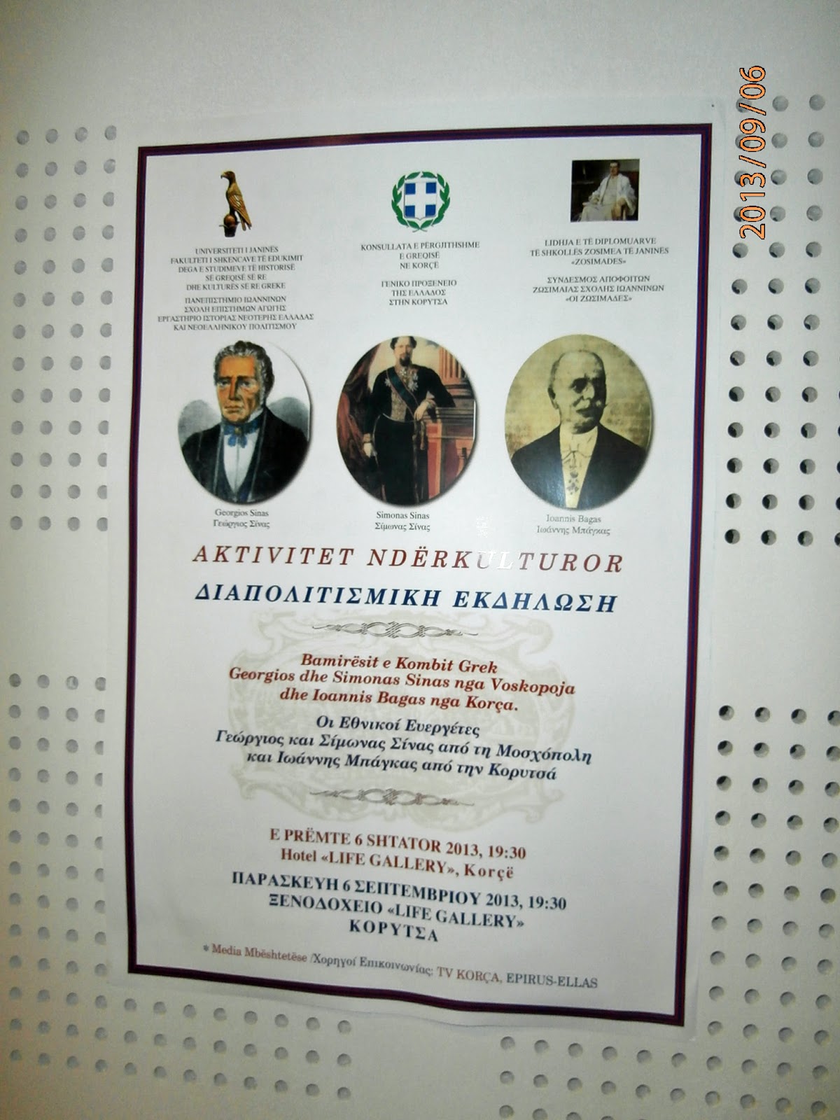 Στις 06 Σεπτεμβρίου 2013 υπό την μέριμνα του Γενικού Προξενείου της Ελλάδος στην Κορυτσά, του Πανεπιστημίου Ιωαννίνων Σχολή Επιστήμων Αγωγής, Εργαστήριο Ιστορίας Νεότερης Ελλάδος και Νεοελληνικού Πολιτισμού, όπως και του Συνδέσμου Αποφοίτων της Ζωσιμαίας Σχολής «Ζωσιμάδες» , διοργανώθηκε διαπολιτισμική εκδήλωση, σε γνωστό ξενοδοχείο της πόλης με θέμα : «Οι Εθνικοί Ευεργέτες Γεώργιος και Σίμωνας Σίνας από την Μοσχόπολη και Ιωάννη Μπάγκα από την Κορυτσά». Η διαπολιτισμική αυτή εκδήλωση ήταν μοναδική στο είδος για την Κορυτσά. Σ’ αυτή μίλησαν ο Φιλόλογος κ Νίκος Υφαντής θέμα « Η Κορυτσά άλλοτε και τώρα », ο καθηγητής Πανεπιστημίου Ιωαννίνων κ Απόστολος Παπαιωάννου θέμα « Η Μοσχόπολη κατά τον 17-18 αιώνα», και ο Φιλόλογος κ. Σπύρος Ευαγγέλου με θέμα « Οι ευεργέτες του Ελληνικού έθνους Γεώργιος Σίνας, Σίμωνας Σίνας, και Ιωάννης Μπάγκας και η ζωή και το έργο τους».
