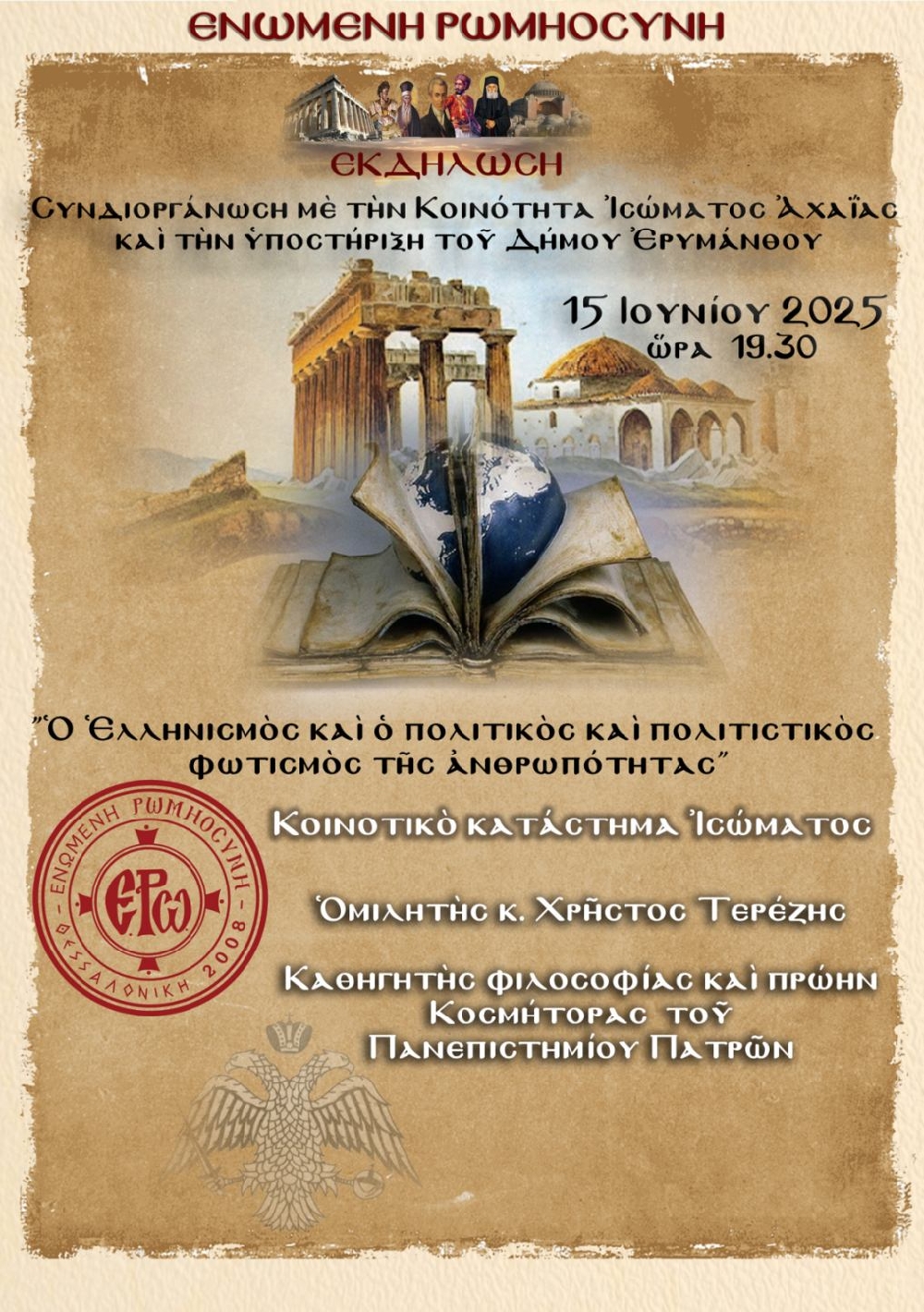 Την Κυριακή 15 Ιουνίου 2025 και ώρα 19.30, η Ενωμένη Ρωμηοσύνη, θα πραγματοποιήσει εκδήλωση στην Πάτρα, στο Κοινοτικό Κατάστημα του Ισώματος Αχαίας, σε συνδιοργάνωση με την ομώνυμη κοινότητα και την υποστήριξη του Δήμου Ερυμάνθου, με θέμα: ” Ο Ελληνισμός και ο πολιτικός και πολιτιστικός φωτισμός της ανθρωπότητας” και ομιλητή τον καθηγητή φιλοσοφίας και πρώην Κοσμήτορα του Πανεπιστημίου Πατρών κ. Χρήστο Τερέζη.