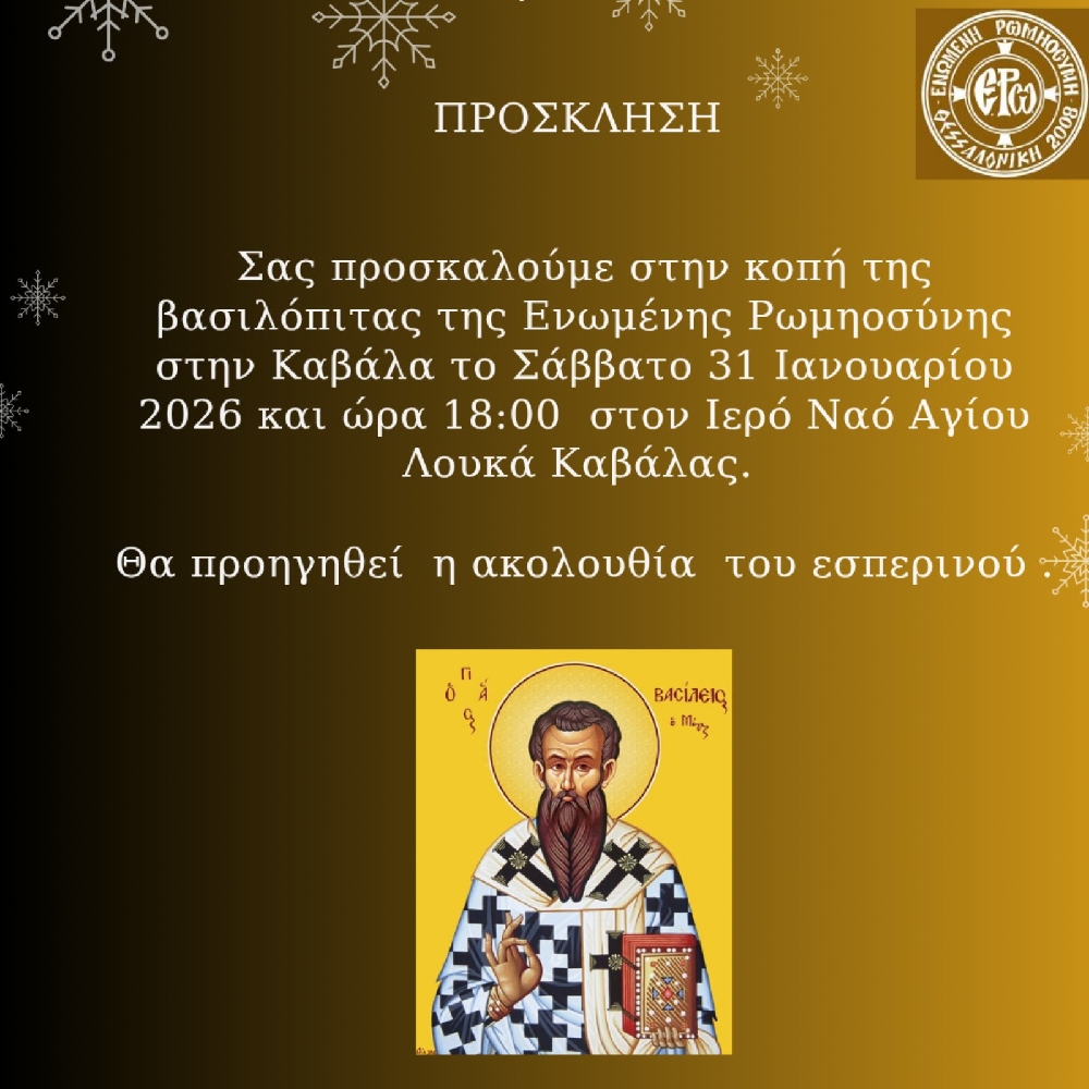 27 Ιανουαρίου 2026 σε ΠΡΟΣΕΧΕΙΣ ΕΚΔΗΛΩΣΕΙΣ, ΧΑΡΤΗΣ ΚΑΒΑΛΑΣ, ΧΑΡΤΗΣ ΡΩΜΝΙΩΝ Ἀγαπητὰ ἐν Χριστῷ ἀδέλφια μας, σᾶς προσκαλοῦμε στὴν κοπή της βασιλόπιτας ποὺ θὰ πραγματοποιηθεῖ τὸ Σάββατο 31 Ἰανουαρίου 2026 ὥρα 18:00 στὸν Ἱερὸ Ναὸ Ἁγίου Λουκᾶ Καβάλας. Θὰ προηγηθεῖ ἡ συμμετοχή μας στὴν ἀκολουθία τοῦ ἑσπερινοῦ. Ετικέτες - Σχετικά Θέματα Ε.ΡΩ. ΚΑΒΑΛΑΣ Ἱερὸ Ναὸ Ἁγίου Λουκᾶ Καβάλας ΚΑΒΑΛΑ κοπή της βασιλόπιτας Προηγούμενο