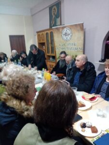 Στην συνέχεια, ζητήσαμε από τον πατήρ Ιωάννη να μας πει λόγο πνευματικό για την ωφέλεια μας. Ο π. Ιωάννης με μεγάλη προθυμία και πατρική αγάπη έλαβε τον λόγο. Μας μίλησε για την νηστεία όπως την θέσπισε η Αγιωτάτη Εκκλησία μας, ότι πρέπει να είμαστε αγωνιζόμενοι Χριστιανοί, σε έναν κόσμο αποστασίας από τον Άγιο Τριαδικό Θεό, να τηρούμε τις εντολές του Θεού και να ελπίζουμε σε Αυτόν.