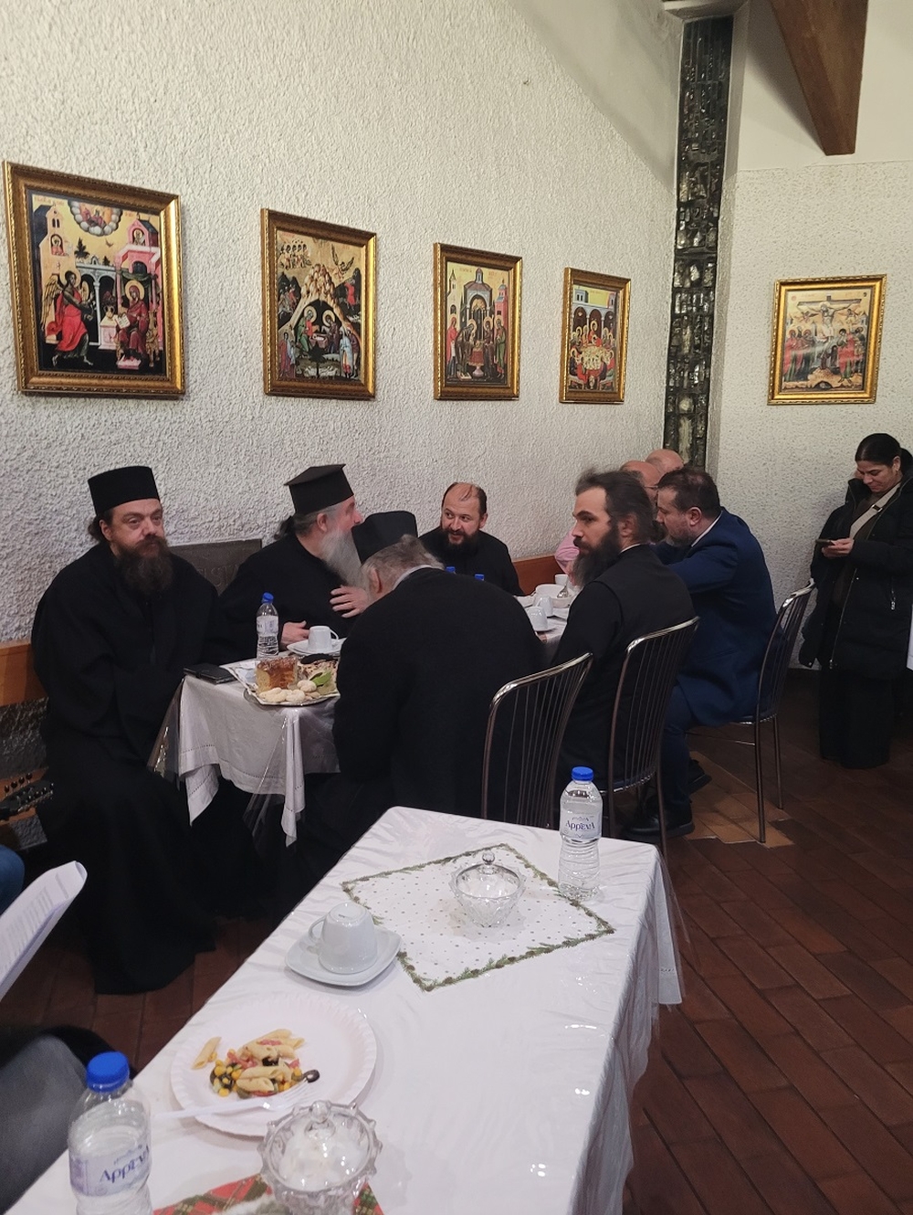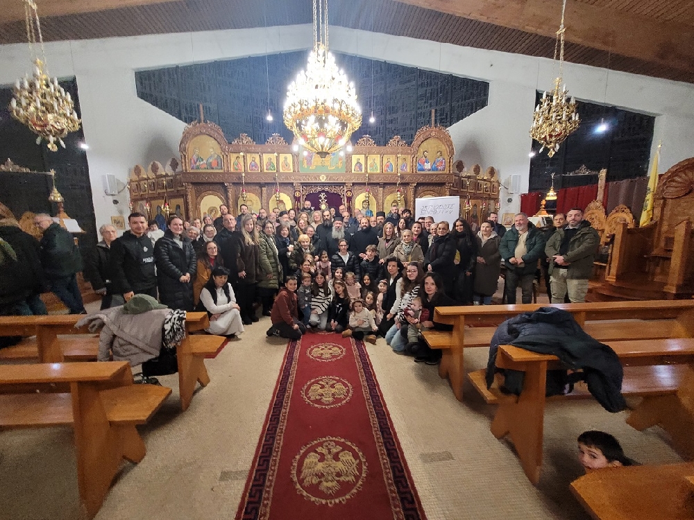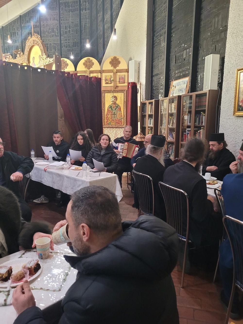 Μετά το πέρας της ομιλίας, ακολούθησε μικρή δεξίωση με διάφορα εδέσματα, προσφέροντας την ευκαιρία για γνωριμία και αδελφική επικοινωνία μεταξύ των πιστών. Η μικρή μας ορχήστρα, με τον αδελφό Αναστάσιο (μπουζούκι), τον Αθανάσιο (ακορντεόν) και τη νεανική χορωδία, δημιούργησε ένα χαρμόσυνο χριστουγεννιάτικο κλίμα, αποδίδοντας παραδοσιακά κάλαντα από όλη την Ελλάδα.
