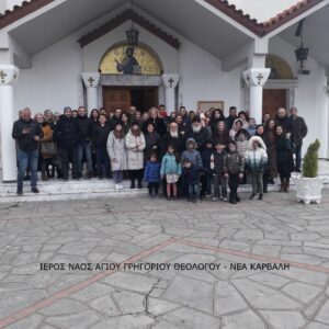 Πολυπληθὴς ὁμάδα προσκυνητῶν μετέβη ἀρχικὰ στὸν Ἱερὸ Ναὸ Ἁγίου Γρηγορίου τοῦ Θεολόγου στὴν Νέα Καρβάλη Δήμου Καβάλας. Ἐκεῖ προσκυνήσαμε τὸ ἅγιο λείψανο τοῦ Ἁγίου Γρηγορίου καὶ εἴχαμε τὴν εὐλογία νὰ μᾶς μιλήσει ὁ ἐφημέριος τοῦ Ναοῦ, πατέρας Μιχαήλ, ὁ ὁποῖος ἀναφέρθηκε στὴν πίστη τῶν προσφύγων ἀπὸ τὴν Καππαδοκία ποὺ ἐρχόμενοι ἀπὸ τὴν πατρίδα τους, ἐν μέσῳ διωγμῶν ἀπὸ τοὺς Νεότουρκους, μερίμνησαν πρωτίστως γιὰ τὴν μεταφορὰ ὄχι μόνο τῶν λειψάνων τοῦ Ἁγίου ἀλλὰ καὶ ἄλλων τμημάτων τοῦ ἐκεῖ ναοῦ (ὀγκώδης δεσποτικὸς θρόνος, Ἐπιτάφιος, πολυέλαιοι, εἰκόνες τέμπλου, εἰκόνες τοίχων, γιὰ νὰ ἀναφέρουμε τὰ πιὸ χαρακτηριστικά), μὴ φειδόμενοι τῶν κόπων καὶ ἐν πολλοῖς δίνοντας προτεραιότητα σὲ αὐτὰ παρὰ στὸ ἴδιο τους τὸ βιός.