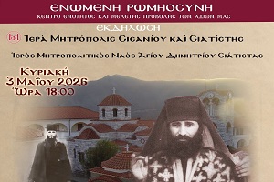 Ἡ ‘’Ἑνωμένη Ρωμηοσύνη’’ ἔχει τὴν χαρὰ νὰ σᾶς προσκαλέσει σὲ ἐκδήλωση- ὁμιλία μὲ θέμα: «Βίος καὶ πολιτεία τοῦ Ἁγίου Γεωργίου Καρσλίδη». Τὸ θέμα θὰ ἀναπτύξει ὁ Σεβασμιώτατος Μητροπολίτης Δράμας κ.κ. Δωρόθεος. Ἡ ἐκδήλωση θὰ πραγματοποιηθεῖ τὴν Κυριακὴ 03 Μαΐου 2026 καὶ ὥρα 18:00 στὸν Ἱερὸ Μητροπολιτικὸ Ναὸ Ἁγίου Δημητρίου Σιάτιστας, τοῦ Νομοῦ Κοζάνης.